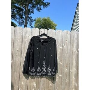 Lane Bryant black embroidered fairy long sleeve top size 18/20. Preowned good condition! Mesh material, sleeves are see through. White floral embroidery detailing. Shell: 100% nylon lining:100% polyester. 22.5 in pit to pit, 25 in top to bottom. Ships in 1-4 Days🐬