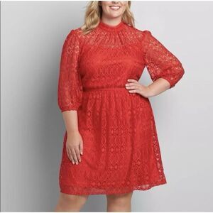 Lane Bryant Plus Size 16 MIDI FIT&FLARE MOCK NECK RED EMBROIDERY LACE Dress