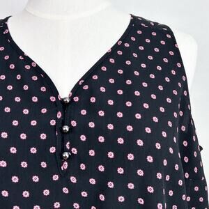 NWT Size 18 Lane Bryant sleeveless top. Lightweight, non-stretch black fabric with a pink geo dot print. V-neckline with a three-button design. Wear this top to the office, layered under a cardigan!