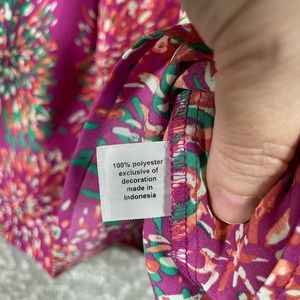 Vibrant purple blouse with floral pattern. Features 3/4 sleeves and a relaxed fit. Perfect for casual wear.