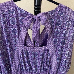 Purple Long Spring Dress with 2 slits at the knees, Silk knee-high liner, Bow tie in back with small cut out (upper back), patterned with lighter shades of purple/ pink/ white/ blue variations