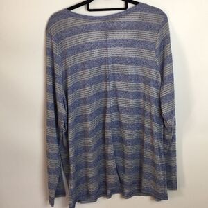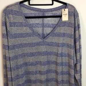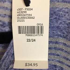 New with Tags Lane Bryant Purple Multi Plus Striped Sparkle Long Sleeve T-Shirt Top Sz 22/24. The color is a bluish purple to me. Gorgeous silver gray sparkly stripes. There’s one spot in the Heathered blue that is darker. It looks almost like a spot, but it’s just darker pigmentation in the fabric in that spot. Measurements in photos.