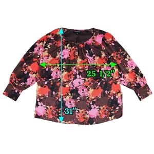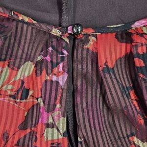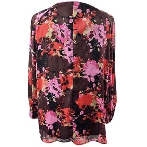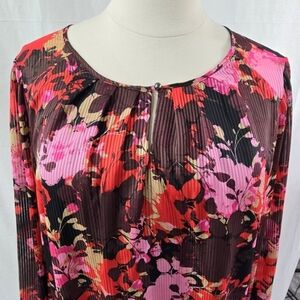 Good used condition, with no stains or tears. A bold, modern floral blouse. Red, burgundy and pink. Has a pleated keyhole neck and button cuffs. The bodice is lined and the sleeves are sheer.