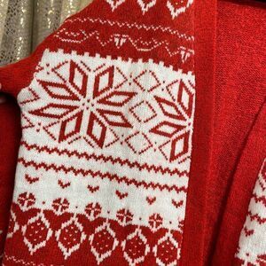 Brand new without tags, this is so cute, perfect for Winter and the Holidays. Smoke and pet free home. No flaws at all. Lane Bryant size 14/16 which fits like an XL. Color is a bright holiday red called Adrenaline Rush. Sold out online and retails for $80. Thicker, soft material. Not itchy at all. Not taking low offers as Ill just keep it til next Holiday season. Its really cute.