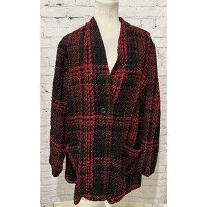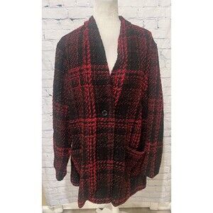 The Lane Bryant Red/Black Plaid Tweed Shimmer Unlined Jacket/blazer is a stylish and versatile outerwear piece designed for plus size women. Made from a polyester blend tweed fabric, this blazer features a classic red and black plaid pattern with a relaxed fit. It has long sleeves, a button closure, and convenient pockets for added functionality. Perfect for travel, casual, or business occasions, this jacket is a timeless addition to any wardrobe, especially for the winter and fall seasons. The timeless style and quality construction make it a standout choice from Lane Bryant. 29 inches pit to pit, 20 inch shoulders, 25 inch sleeves and 33 inches long. Smoke free home.