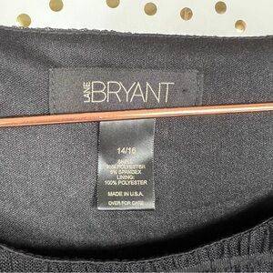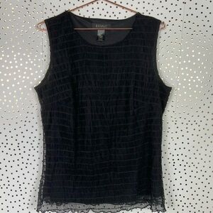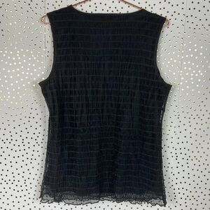 Lane Bryant tank. Black sheer ruched overlay with a lettuce hem. Great elevated basic. Shell: 95% Polyester, 5% Spandex. Lining: 100% Polyester. Size 14/16.