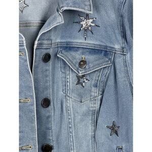 Lane Bryant light wash denim jacket with dark metal buttons down the front and sequin stars sewn on random places all over the jacket