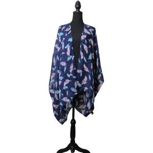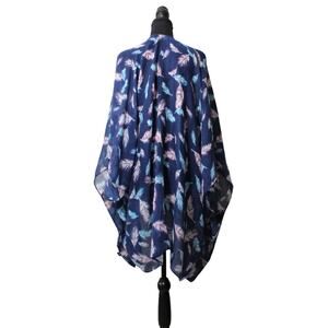 Lane Bryant sheer navy kimono with a colorful feather print in shades of blue, pink, and white. Open front style with a relaxed drape and high-low hem. Made from 100% polyester—lightweight and perfect as a layering piece. Measures approximately 30.5" long and 43" across when laid flat. Fits closer to a size Medium based on measurements and drape. No size tag.