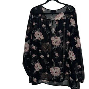 Lane Bryant Sheer Floral Long Sleeve Blouse Size 22/24 Black & Pink Roses Womens