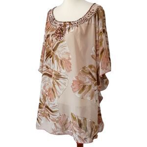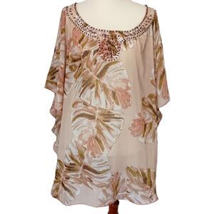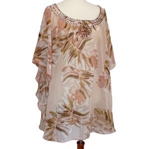Lane Bryant Sheer Poncho Top Sz 2X 18 20 Beaded Leaf Print Tropical Kimono Flowy