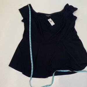 Lane Bryant black off shoulder cap sleeve peplum blouse. Structured V neckline with wire to hold shape of V. Peplum swingy flare hem with pleats. Stretchy.