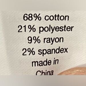 • Fabric: 68% Cotton, 21% Polyester, 9% Rayon, 2% Spandex