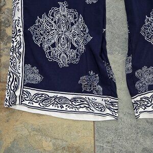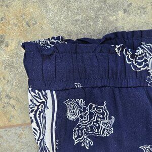 Navy blue pants with white design and white accent stripe on sides. High rise elastic waistband with drawstring tie at the front. Wide leg. No pockets. Lightweight. Flowy. Pull on style.