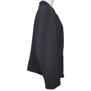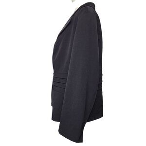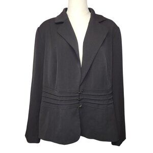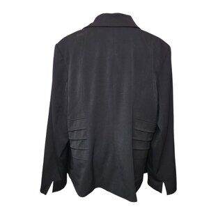 Lane Bryant black single-breasted blazer with three rhinestone hook and eye closures. Horizontal pleats on front waist and sides of back. Slits on wrists for ease of folding up if desired. Stretch. Fully lined. No pockets. Pre-owned in excellent condition.