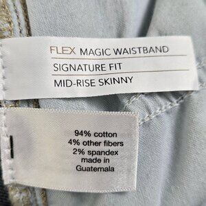 Mid-Rise skinny jean in the Signature Fit. Features Flex Magic Waistband. 5 pocket style. Belt loops. Zip fly with 1 button top closure. Distressed finish. Slight curve waist to hip.