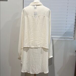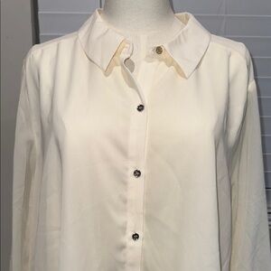 Elegant cream button-down shirt. Features long sleeves and classic collar. Perfect for versatile styling.