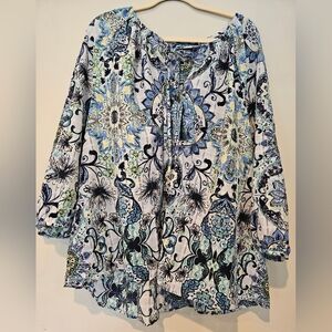 Lane Bryant Size 26/28 (4X) 3/4 Sleeve Notch Neck Tie Front Blouse Blue Geo Floral print. Gorgeous lightweight blouse. Please see the measurements in photos provided. In great Pre-owned condition. Cross posted. I ship out same or next day. I carry lots of Plus Sizes in my store. Thanks for looking!