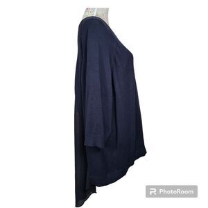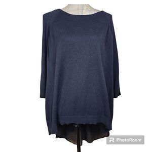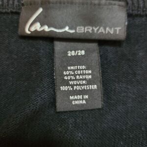 Elevate your style with this stylish Lane Bryant black lightweight sweater with three quarter length sleeves in a women's size 26-28. Made from a lightweight and comfortable cotton and rayon blend fabric, this high low sweater offers a relaxed and flattering fit. The three quarter length sleeve length adds a touch of sophistication, perfect for transitioning between seasons. This eye-catching sweater also features a long, sweeping sheer chiffon back, adding an elegant and unexpected detail. This Lane Bryant sweater is in excellent pre-owned condition, ensuring its quality.