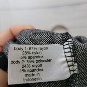 Body 1: 67% rayon 28% nylon 5% spandex. Body 2: 75% polyester 24% rayon 1% spandex