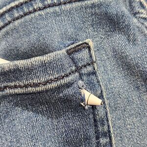 These jeans have a hole in one back pocket, not sure if it's part of the Distressed style , Check photos for details