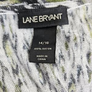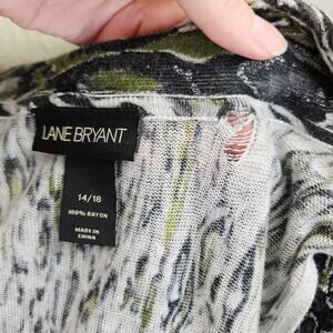Effortlessly stylish and lightweight, this Lane Bryant sleeveless open front cardigan vest adds instant flair to any outfit. Featuring a draped handkerchief hem and a bold black, white, and olive green abstract pattern, it’s the perfect layering piece for year-round wear — from casual weekend looks to office chic.