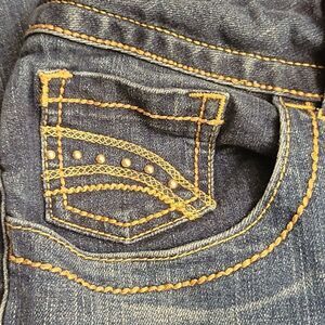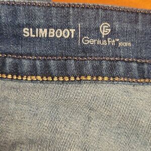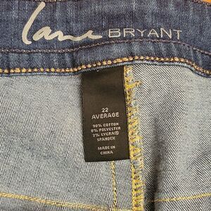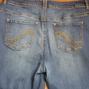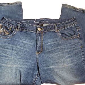 SlimBoot Genius Fit jeans from Lane Bryant. Gold studs on watch pocket and with embroidery on back pockets as well. Nice wash and lots of stretch. Pls see last 2 pics for slight discoloration on front lower leg and frayed hems at back (but a desired look). Still lots of life left in them!