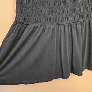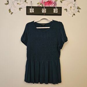 Dark teal color my camera hates green so it shoes up weird. Smocked bodice with puff sleeves and peplum bottom. Extra stretchy to fit a variety of busts.