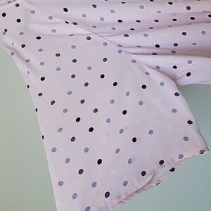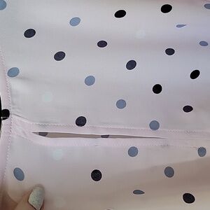 Light pink color with gray blue and black polka dots all over. Sheer. Has a slight at the neck. Approx elbow length roomy sleeves. Keyhole opening in back with single button closure. Ties on the side. Great condition. Office, workplace, career, whimsical, brunch, pastel, girly, going out, summer, spring, sophisticated, romantic, plus, curvy