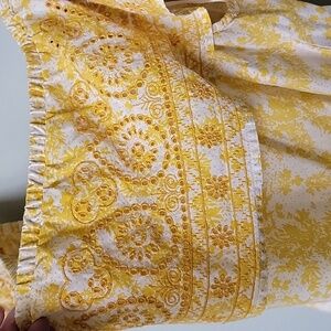 Yellow and white leaf pattern detail. Lightweight fabric. Side split hem. Elastic around the shoulders. Great condition. Girly, flirty, casual, picnic, park, brunch, date, fiesta, colorful, vibrant, attention, vacation, tomato girl, sweet, twee, boho ,hippie, sun, vacation, travel, outing, garden, dainty, 100% cotton, euro summer