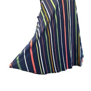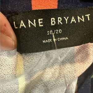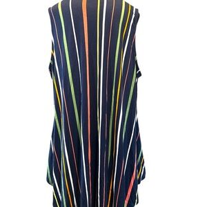 This sleeveless tunic by Lane Bryant features a navy blue base with vibrant multi colored stripes, perfect for Summer fun. The crew neck and A-line style offer a flattering silhouette, making it a stylish addition to any wardrobe.