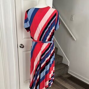 Vibrant dress with diagonal stripes. Features a mix of red, pink, blue, and navy blue.Includes a matching belt.excellent condition smoke free home