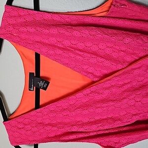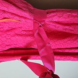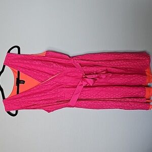 Tagged as a size 18, however I feel this closer fits a 16, see measurements. Vibrant pink lace all over. Lined with a vibrant orange. Pink ribbon belt sash. Hidden side zipper closure. Surplice chest. Dopamine, spring, brunch, casual, girly, cutwork, feminine, dainty, delicate, summer, curvy, plus