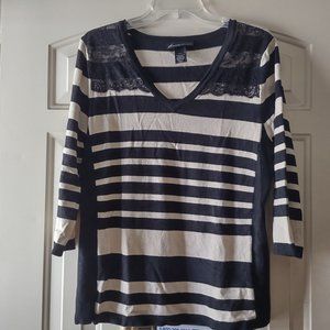 In very good used condition (minor piling under the arms). Super cute and soft V-neck pullover sweater with 3/4-length sleeves. Black and cream stripes with black lacing on the front shoulder (note: this is not transparent -- the lace lays on top of the sweater, so no see-thru!).