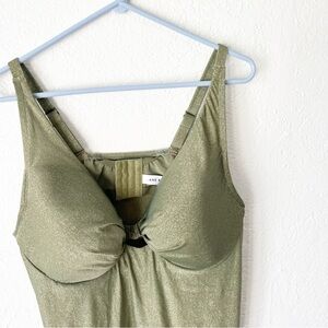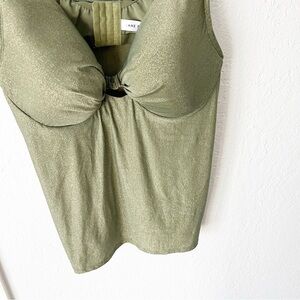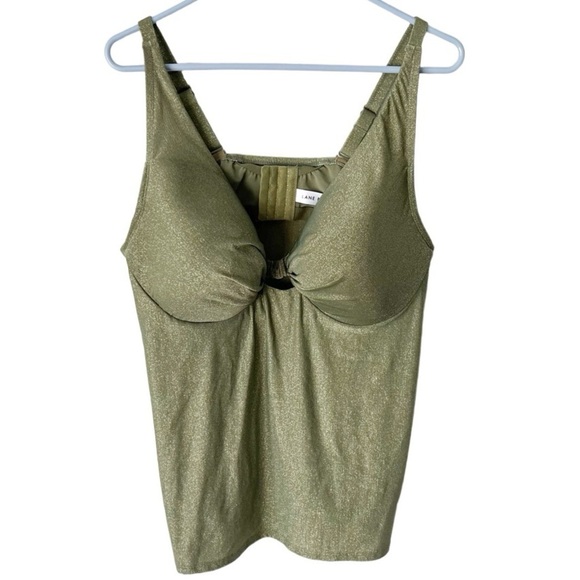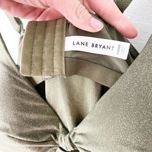 DETAILS: Lane Bryant swim top women's 40DDD, plunge front with knot detail, underwire, back hook and eye closure for support, adjustable straps, green shimmer. Nylon blend, hand wash.