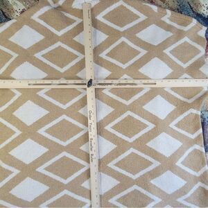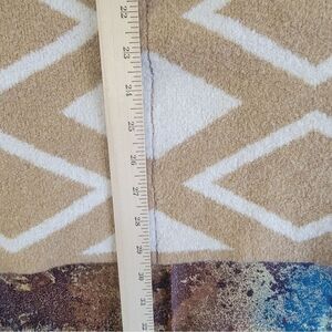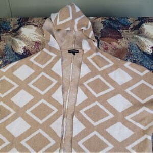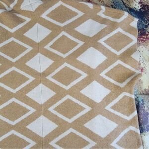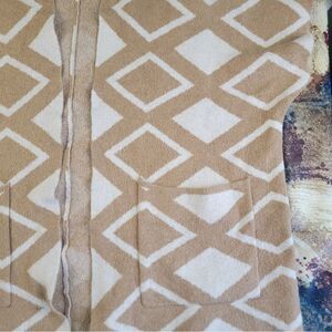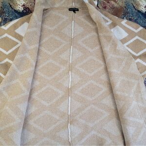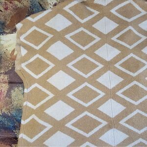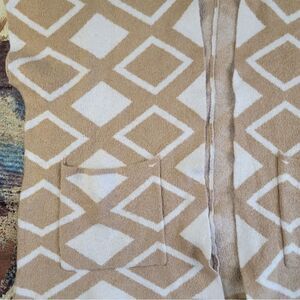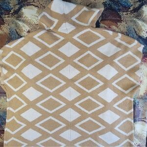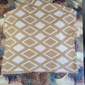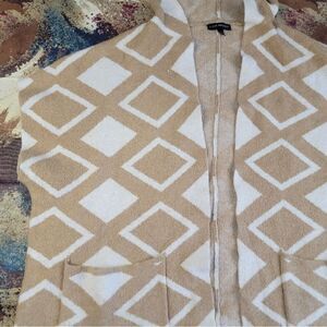 Stylish poncho with geometric pattern. Features open front and pockets. Perfect for layering.