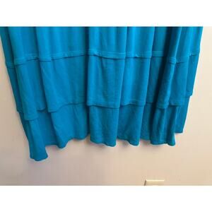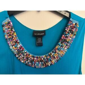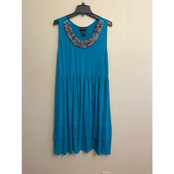 Lane Bryant sleeveless dress in a beautiful teal blue color. Features a stretchy rayon blend, flowy tiered skirt, and colorful beaded neckline detail. Comfortable and flattering fit with great movement. Perfect for summer, vacation, casual events, or layering.
