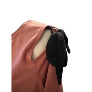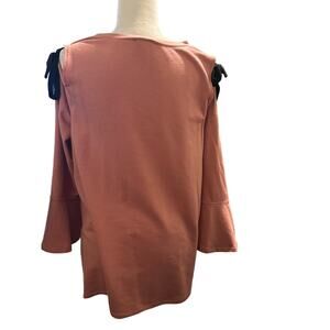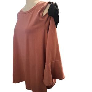 Lane Bryant Tie Sleeve Cold Shoulder Blouse, Terracotta Rose, Plus Size 14/16. Features a trendy cold shoulder cutout with contrasting black bow tie details, wide bell sleeves, and a relaxed, flowy silhouette. Stylish yet comfortable, this top works great for both casual and dressy occasions. Excellent condition.