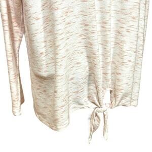 V-neck with button detail. Long sleeves. Tie-front hem. Super-soft lightweight hacci fabric. Slightly shorter front length.