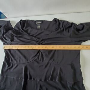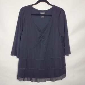 Lane Bryant Tiered Black V-neck Top Size 18/20. Semi-sheer, versatile, flirty, pullover top with stretch has ruching at the neckline and figure flattering tiers.