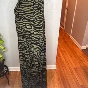 Lane Bryant Tiger Print Long Sleeves Crossover Side Ruche Midi Dress, This fun dress is stretchy and lightweight, color olive and black, cross over side ruched, split is on the front side of dress, elastic waist with hanging string, machine wash in cold water, 95% polyester and 5% spandex