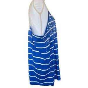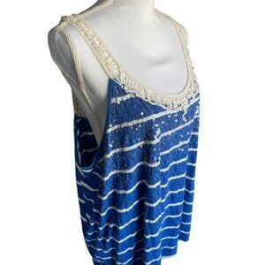 This Lane Bryant top blouse shirt in plus size 22-24 features a vibrant blue and white lace design, adorned with clear sequins. The cotton-modal material ensures comfort while showcasing style.