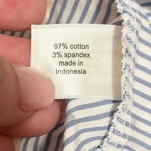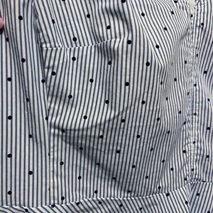 Crisp cotton sleeveless blouse with a v-neck front and back. Easy zip pull at back. Blue and white striped pattern with blue dots. Peplum hem.