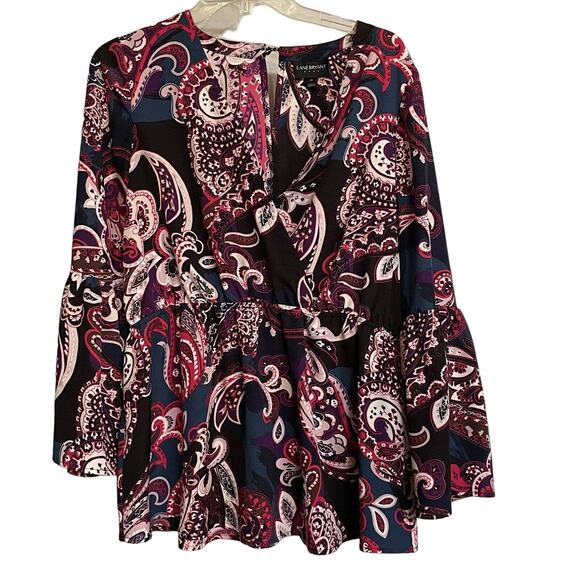 Lane Bryant Top Multicolor Paisley Print Long Bell Sleeve Wrap Blouse sz 14 EUC