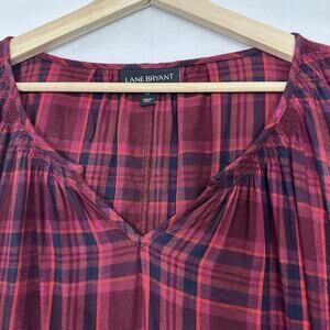 Lane Bryant Top Women 22 Red Plaid Long Sleeve Rayon Cottage Boho Peasant Preppy