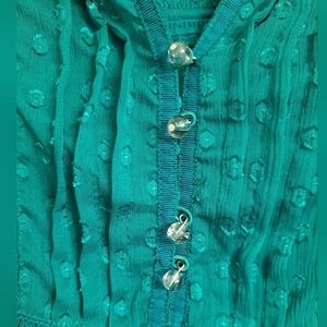 very good condition, semi sheer fabrication, round neckline with small open v-neck, four workable clear buttons, pleated yoke, flutter sleeves, round hemline, 100% polyester, pit to pit 20" sleeve 9.5" length 28"