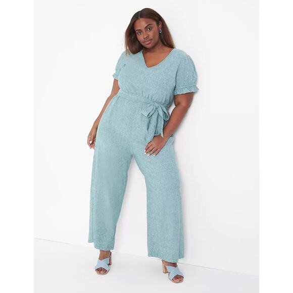 Lane Bryant V neck short Puff-Sleeve Linen Jumpsuit in green size 22