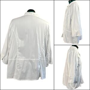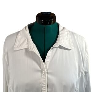 Women's button up shirt from Lane Bryant in solid white. Three quarter sleeves with decorative buttons, A v-neckline and collar. 97% Cotton 3% Spandex. Due to light & screen variations, colors may vary slightly from the images