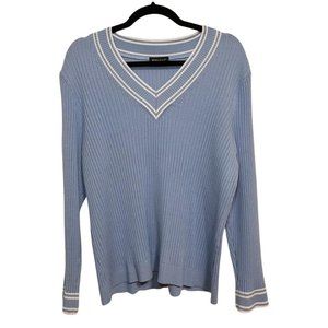 Very cute and comfy Lane Bryant v-neck cricket long sleeve sweater in color blue, with white lines around neck and wrist. No obvious flaws.