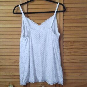 Lane Bryant VNeck Lace Trim Polka-dot Baby Doll Camisole Size 14/16. Measurements are approximate. Chest underarm to underarm 19 inches. Length from underarm to hemline 19 inches. 94% rayon 6% spandex. Questions and offers welcome.