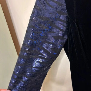 V neck, black velvet, Sheer long sleeves with blue sequins, back zip, off shoulder look